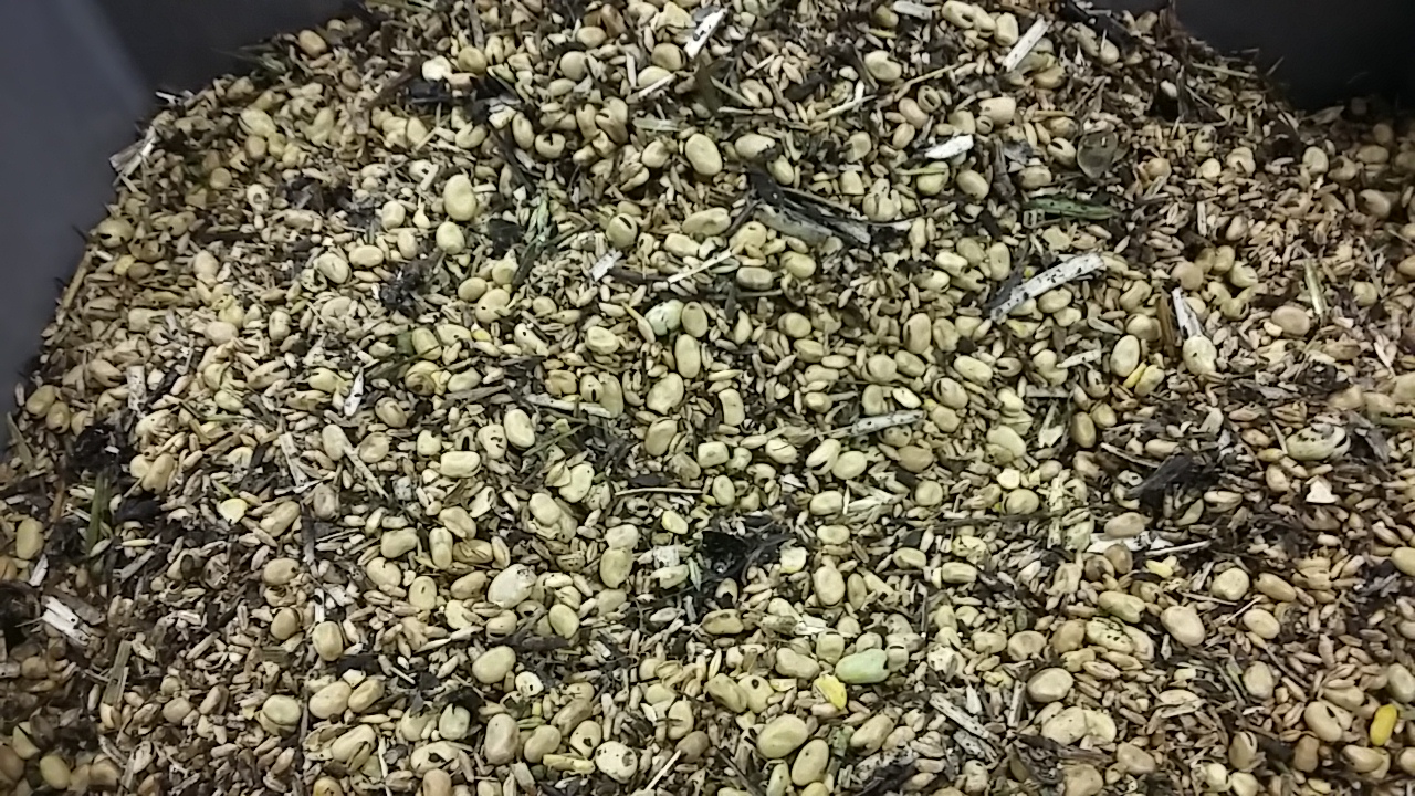 De veldbonen bevonden zich in een deegrijp stadium (te zien aan de lichtgroene kleur van de veldbonen) bij de oogst van de mengteelt
