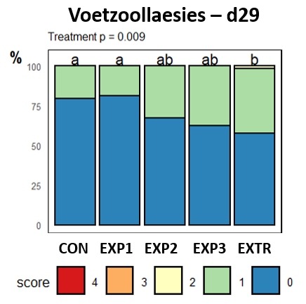 Zowel op d29 als op d40 werd bij 8 willekeurige vleeskuikens per hok de voetzool- en haklaesies gescoord. De extrusiegroep bleek meer voetzoollaesies te hebben op d29, en ondanks dat het niet significant verschillend was, is te zien in figuur 1 dat de voetzoollaesies toe lijken te nemen naarmate de hittebehandelingen van de mengteelten intenser werden. Op d40 werden geen significante verschillen meer waargenomen. Bij de proefgroep met de getoaste veldbonen waren geen verschillen te zien in voetzool- en haklaesies (niet op d29, noch op d40).